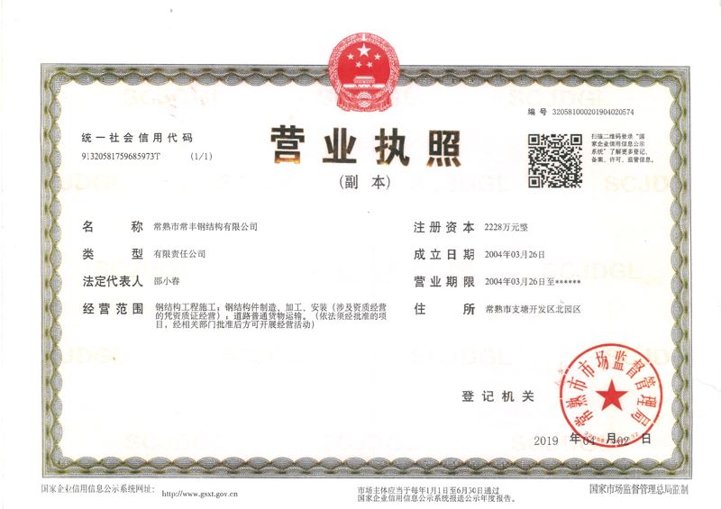常熟市常豐鋼結構有限公司,位于風景秀麗的常熟市支塘鎮(204國道旁)毗領蘇嘉杭高速公路,水陸交通十分便利。 本公司成立于2001年,是承接重鋼、輕鋼,景觀鋼構,鋼管桁條,網架、彩鋼板專業制作、安裝一體的企業,并取得國家建設部頒發的鋼結構專業承包安裝二級資質,是蘇州地區具有較高的知名度和較高競爭企業。 公司擁有工程師8人,技術人員26人,職工150多人。并擁有一支專業的鋼結構安裝隊伍。公司總占地面積25000m2,鋼結構公司占地面積11000m2。公司擁有先進的H型鋼生產設備,擁有數控多頭直線切割機,阻力機,自動埋弧焊機,矯正機,拋丸除銹機等設備,并配備有輕鋼結構輔助生產設備,電腦數控C型鋼成型機,各規格彩鋼壓型瓦生產設備及彩鋼夾芯板流水線設備。公司嚴格把關質量100%的為客戶提供優質產品。 多年來,我公司依靠自身的設計、織造能力,已為數百萬